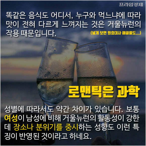 일례로 똑같은 음식이지만 어디서, 누구와 먹느냐에 따라 맛이 전혀 다르게 느껴지는 것은 거울뉴런의 작용 때문입니다.