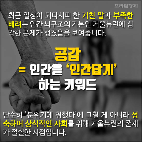 최근 일상화된 언어폭력 및 타인에 대한 배려 부족은 사회 구성원 상당수가 인간 뇌구조의 기본인 거울뉴런에 심각한 문제가 생겼음을 증명한 것으로 볼 수 있습니다. 단순히 '분위기에 취했다'에 그칠 게 아니라 성숙한 사회생활을 위해 거울뉴런의 존재를 상기할 때입니다.