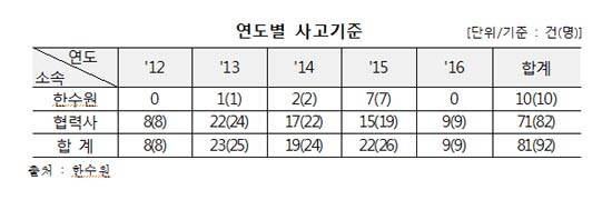 29일 신용현 국민의당 의원(미래창조과학방송통신위원회)이 한수원으로부터 받은 자료를 분석한 결과, 최근 5년간 일어난 81건(사상자 92명)의 사고 중 하청업체(협력업체)의 사고 비중이 71건(사상자 82명)에 달하는 것으로 나타났다.