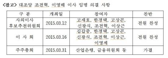 이사회 역시 상황은 비슷해 이사 7명 중 5명이 사추위 위원인 △한경택 △고상곤 △신광식 △조전혁 △이상근으로 이사회에서도 역시 전원찬성으로 임명안을 통과시켰다.