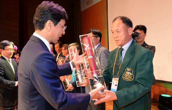 안 지사는 이 자리에서 세계 한인체육회 총연합회장 및 17개 선수단장에게 전국체전을 기념하는 성화봉을 증정했다. 행사 마지막은 참석자 모두가 손을 잡고 '홀로아리랑'을 합창하는 화합의 한마당이 펼쳐졌다.