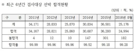 특히 세월호 참사 이전인 2013년의 경우 2만5860건의 검사 중 불합격은 10건에 불과했고 합격률이 99.96%에 달했다. 이후에도 99%대의 합격률은 떨어지지 않고 있다.