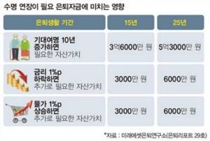 하지만 수명 연장으로 은퇴생활 기간이 25년이 되면 5억3000만원을 가져야 하죠.