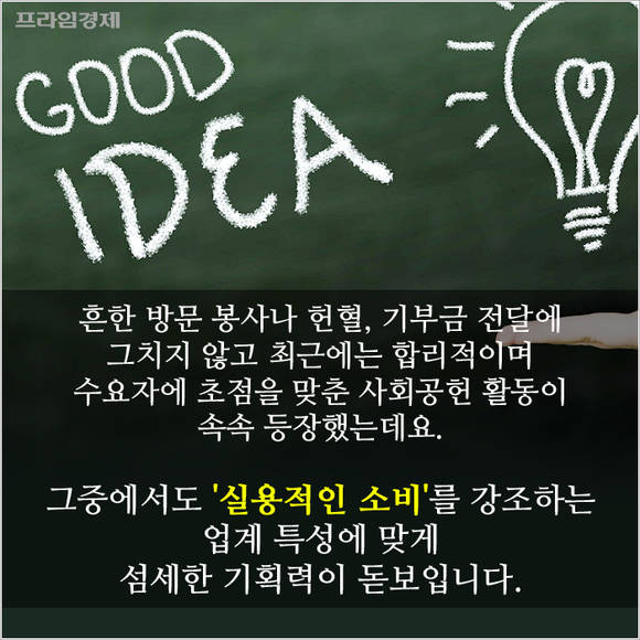 기존 소외계층 방문 봉사나 헌혈, 기부금 전달 등으로 마음을 표현하던 것에서 최근에는 합리적이고 수요자에 초점을 맞춘 공헌 행사가 속속 등장하고 있는데요. 그중에서도 '실용적인 소비'를 강조하는 업계 특성에 맞춰 섬세한 기획력이 돋보입니다.
