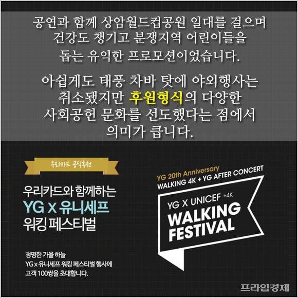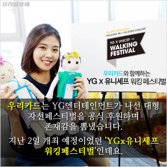 우리카드는 YG엔터테인먼트가 나선 대형 자선페스티벌을 공식 후원하며 존재감을 뽐냈습니다. 지난 2일 개최 예정이었던 'YGx유니세프 워킹페스티벌'인데요.