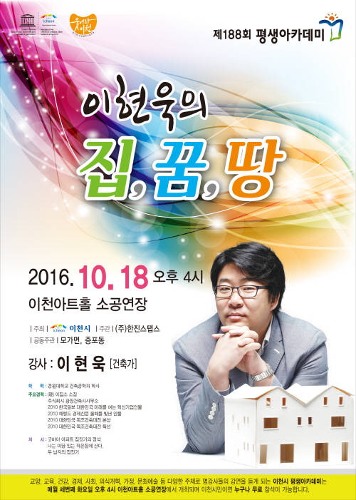 [프라임경제] 경기 이천시(시장 조병돈)은 오는 18일 오후 4시 이천아트홀 소공연장에서 이현욱 강사를 초청해 '이현욱의 집, 꿈, 땅'을 주제로 제189회 이천평생아카데미를 개최한다.