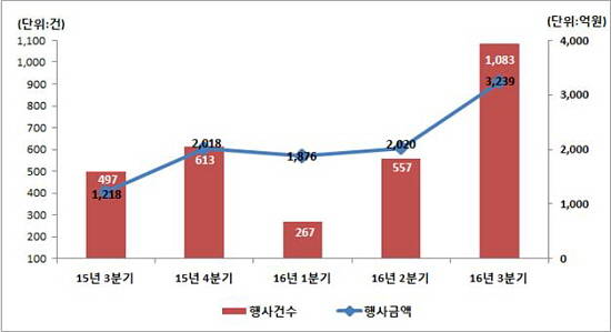 12일 예탁결제원에 따르면 3분기 주식관련사채의 권리행사는 총 86종목으로 직전 분기 55종목보다 큰 폭 증가했다. 행사건수는 1083건으로 직전분기 557건 대비 94.4%, 행사금액은 3239억원으로 60.3% 급증했다.