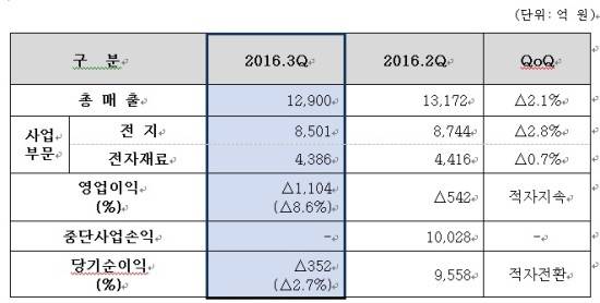 3분기 매출은 전분기 대비 272억원(△2.1%) 감소했고, 영업이익은 갤럭시노트7 이슈 관련 충당금 등 일회성 비용을 반영해 1104억원의 적자를 기록했다.