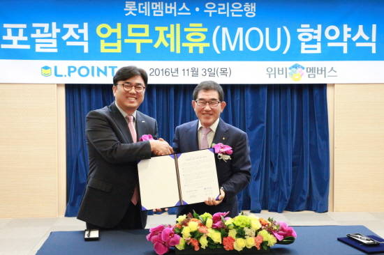 우리은행은 서울시 중구 소공로 소재 우리은행 본점에서 남기명 우리은행 국내그룹장과 강승하 롯데멤버스 대표이사가 참석한 가운데 포인트 제휴 업무협약을 체결했다고 3일 밝혔다.
