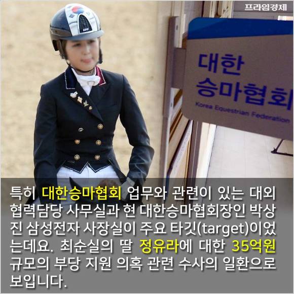 특히 대한승마협회 업무와 관련이 있는 대외협력담당 사무실과 현 대한승마협회장인 박상진 삼성전자 사장실이 주요 타깃(target)이었는데요. 최순실의 딸 정유라에 대한 35억원 규모의 부당 지원 의혹 관련 수사의 일환으로 보입니다.