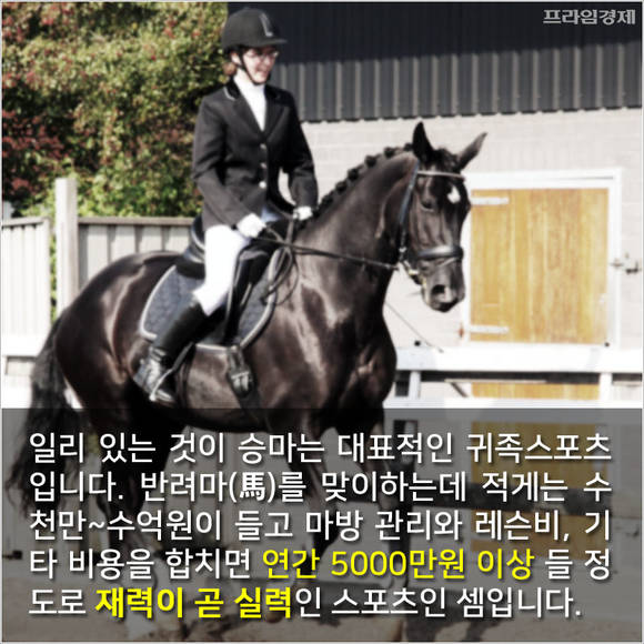 일리 있는 것이 승마는 대표적인 귀족스포츠로 통합니다. 반려마(馬)를 맞이하는데 적게는 수천~수억원으로, 정씨는 10억원을 들였다고 합니다. 여기에 마방 관리와 레슨비, 기타 비용을 합치면 연간 5000만원 이상 들 정도로 재력이 곧 실력인 스포츠인 셈입니다.