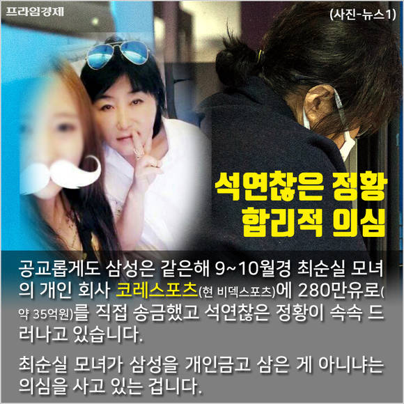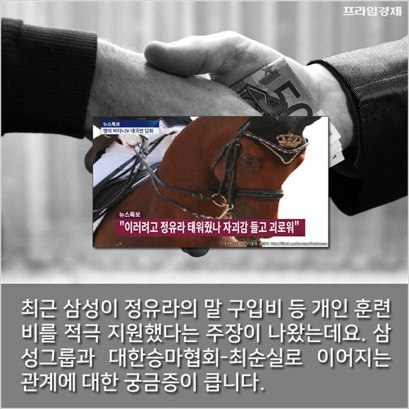 공교롭게도 삼성전자는 작년 9~10월경 최순실, 정유라 모녀 소유의 스포츠컨설팅회사 '코레스포츠'(현 비덱스포츠)에 280만유로(약 35억원)를 직접 송금했다는 정황이 속속 드러나고 있습니다. 사정당국은 이 돈 대부분이 정씨 훈련마 구입과 훈련 지원에 쓰인 것으로 의심하고 있는 겁니다.