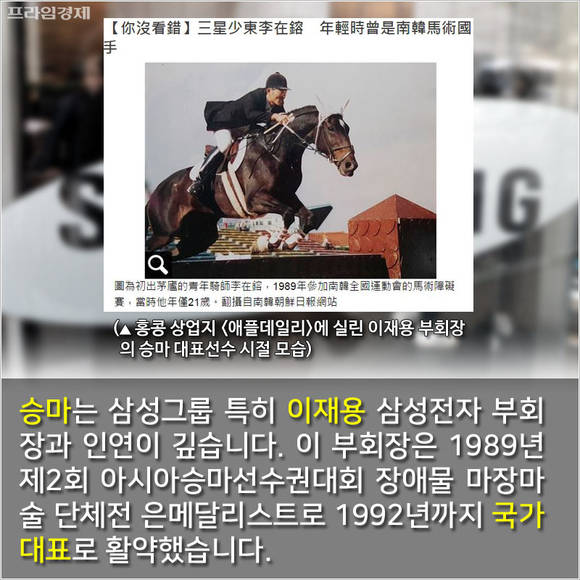 승마는 삼성그룹 특히 이재용 삼성전자 부회장과 인연이 깊습니다. 이 부회장은 1989년 제2회 아시아승마선수권대회 장애물 마장마술 단체전 은메달리스트로 1992년까지 국가대표였습니다.