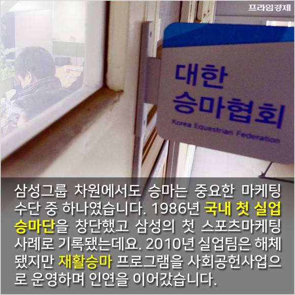 삼성그룹 차원에서도 승마는 중요한 마케팅 수단 중 하나였습니다. 1986년 국내 첫 실업승마단을 창단했고 삼성의 첫 스포츠마케팅 사례로 기록됐는데요. 2010년 실업팀은 해체됐지만 재활승마 프로그램을 사회공헌사업으로 운영하며 인연을 이어갔습니다.