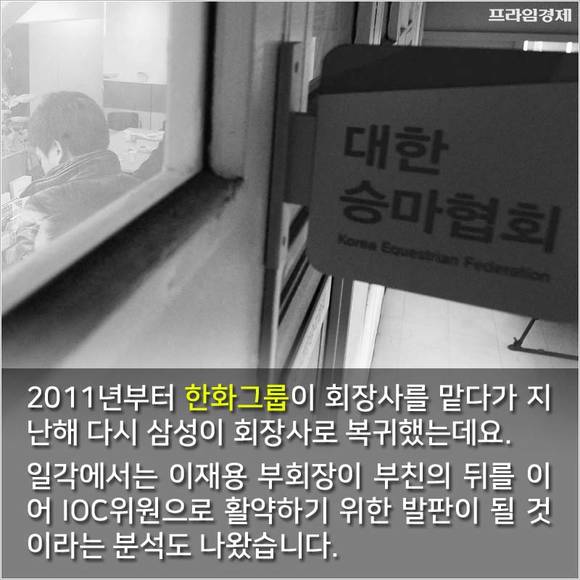 2011년부터는 한화그룹이 회장사를 넘겨받았지만 정윤회 논란 이후인 지난해 다시 삼성이 회장사로 복귀했습니다. 일각에서는 이재용 부회장이 부친의 뒤를 이어 IOC위원으로 활약하기 위한 발판이 될 것이라는 분석도 나왔습니다.
