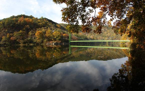 입곡군립공원의 명물로 자리 잡은 연두색 출렁다리는 국내에서 기둥과 기둥 사이가 가장 긴 현수교로 길이가 무려 96m에 달하며, 다리에서 바라보는 단풍과 팔각정에서 내려보는 저수지 풍경 또한 장관을 이룬다.