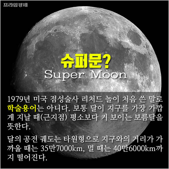 '슈퍼문(Super Moon)'은 1979년 미국 점성술사 리처드 놀이 처음 쓴 말로 공식 학술용어는 아니다. 보통 달이 지구를 가장 가깝게 지날 때(근지점) 평소보다 커 보이는 보름달을 뜻하며 타원형인 달의 공전 궤도에 따라 지구 사이의 거리가 가까울 때는 35만7000㎞, 멀 때는 40만6000㎞까지 벌어진다.