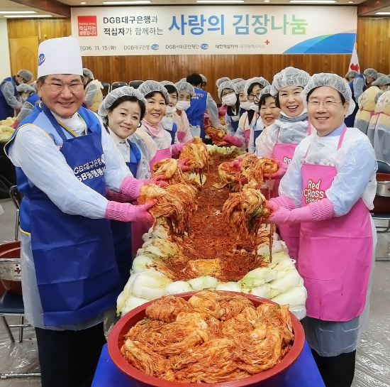 [프라임경제] DGB금융그룹 대구은행(은행장 박인규)은 15일 대한적십자사대구지사 별관에서 신입행원 및 부인회 봉사자 50여명과 대구적십자사 봉사단원 30여명이 참여해 사랑의 김장나눔 행사를 실시했다.