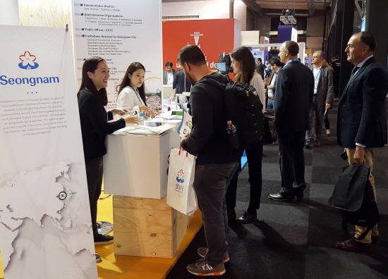 15일(현지시각) 김진흥 성남시 부시장의 'ICT를 접목한 성남시 감성행정' 사례 발표에 이어 성남시 전시부스에 사업가와 현지 방송사의 발길이 이어졌다. 성남시는 세계도시전자정부협의체인 위고(WeGO)와 함께 성남시 현황, 체납액 징수 일원화 정책 등을 내용으로 구성한 전시부스를 선보였다.