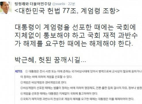 그래서 정청래 전 의원이 자신의 SNS를 통해 박 대통령에 의한 계엄 선포 불가론을 거론한 것도 청와대가 정치적 정통성을 잃었다는 식의 무시 발언이기도 하지만, 현실 가능성이 없다는 점도 함께 반영한 것으로 읽힌다.