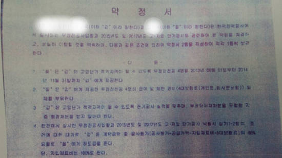 약정서의 내용은 충격적이다. 이들은 A체를 '갑', B업체를 '을'로 정하고 '을은 갑의 고압단가 적격자격이 될 수 있도록 무정정공 4명을 2013년 9월1일부터 2014년 11월31일까지 갑에게 제공한다'는 내용을 적시했다.