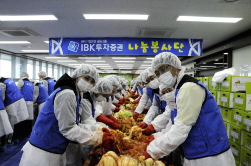 IBK투자증권 사내봉사단체인 '나눔봉사단' 170여명은 19일 서울 구로구청에서 약 4500㎏의 김치를 담갔다.