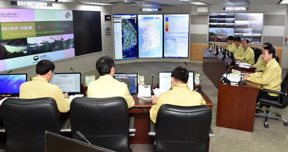 [프라임경제] 김용하 산림청 차장(오른쪽 첫 번째)은 21일 정부대전청사 중앙산불방지대책본부에서 가을철 산불방지 대책 추진현황을 보고 받은 뒤 산불 발생과 피해 최소화를 당부했다.