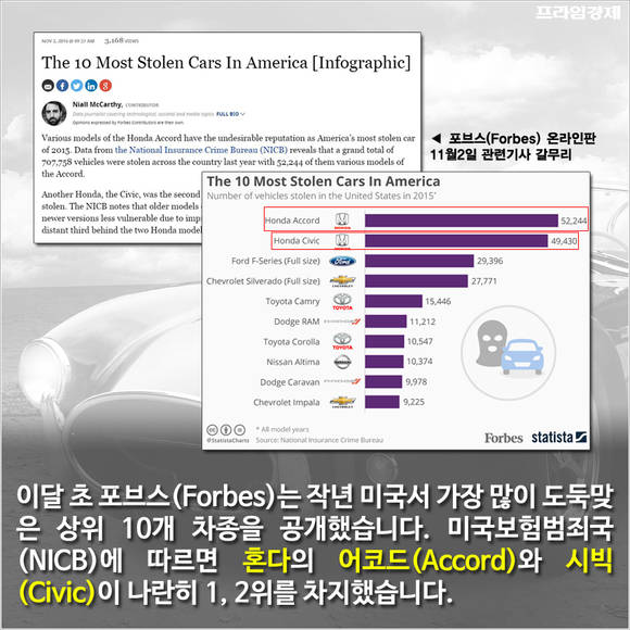 [프라임경제] 이달 초 포브스(Forbes)는 지난해 미국에서 가장 많이 도둑맞은 상위 10개 차량을 공개했다. 미국보험범죄국(NICB)에 따르면 혼다의 어코드(Accord)와 시빅(Civic)이 나란히 1, 2위를 차지했다.