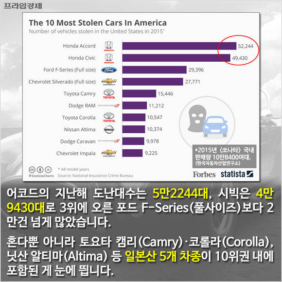 어코드의 지난해 도난대수는 5만2244대, 시빅은 4만9430대로 3위에 오른 포드 F-Series(풀사이즈)보다 2만건 넘게 많았다. 혼다뿐 아니라 토요타 캠리(Camry)·코롤라(Corolla), 닛산 알티마(Altima) 등 일본산 5개 차종이 10위권 내에 포함된 게 눈에 띈다.