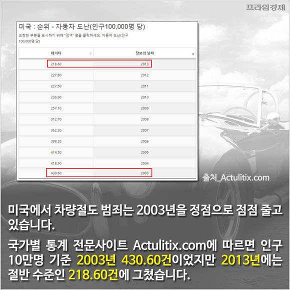 그런데 이를 다르게 해석할 여지가 있다. 미국에서 차량절도 범죄는 2003년을 정점으로 점점 줄고 있다. 국가별 통계 전문사이트 Actulitix.com 자료를 보면 인구 10만명 기준 2003년 430.60건이었지만 2013년에는 절반 수준인 218.60건에 그쳤다.