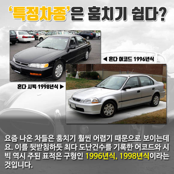 최근 출시된 차들은 이전만큼 훔치는 게 어려운 까닭이다. 이를 뒷받침하듯 최다 도난건수를 기록한 어코드와 시빅 역시 주된 표적은 구형인 1996년식, 1998년식이다.