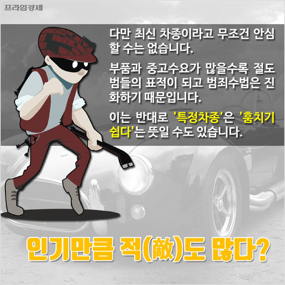 다만 최신 차종이라고 무조건 안심할 수는 없다. 부품과 중고수요가 많을수록 절도범들의 표적이 되고 범죄수법은 진화하기 때문이다. 그러나 반대로 보면 '특정차종'은 '훔치기 쉽다'는 뜻일 수도 있다.