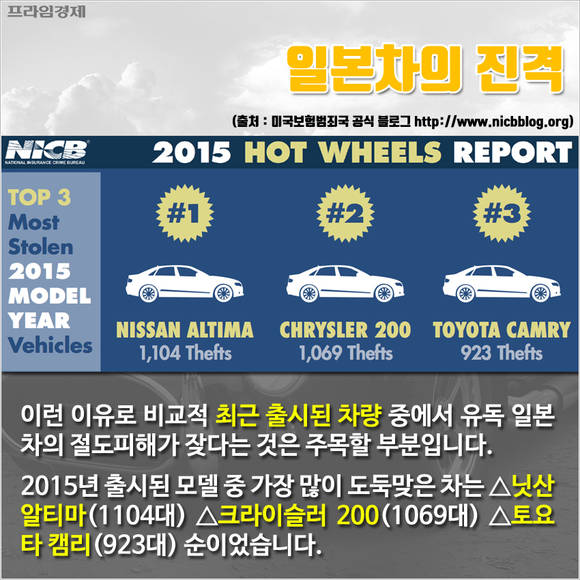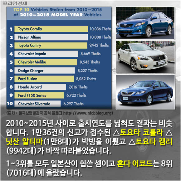 이런 이유로 비교적 최근 출시된 차량 중에서 유독 일본차의 절도피해가 잦다는 것은 주목할 부분이다. 2015년 출시된 모델 중 가장 많이 도둑맞은 차는 △닛산 알티마(1104대) △크라이슬러 200(1069대) △토요타 캠리(923대) 순이다.