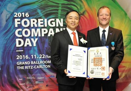이번 시상은 '2016 외국기업의 날'을 맞아 산업통상자원부 주최, 한국외국기업협회(FORCA) 주관으로 이뤄졌다. 한 해 동안 우리나라 경제발전과 외국인 투자유치 활동에 지대한 노력을 기울인 외국인투자유치 유공자들의 공로를 치하하고자 마련됐다.