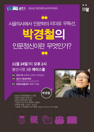 [프라임경제] 경기 용인시는 시민을 위한 무료 교양강좌인 '레인보우아카데미'의 올해 마지막 강의로 '시골의사'로 알려진 박경철씨를 선택했다. 박경철씨는 오는 24일 오후2시 용인시청 에이스홀에서 강연을 하게 된다.