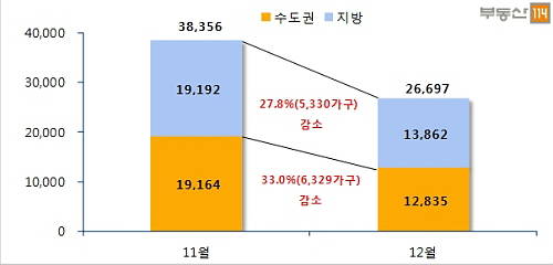지역별로는 수도권이 33.0%(6329가구) 감소한 1만2835가구가, 지방은 27.8%(5330가구) 감소한 1만3862가구가 집들이를 시작할 예정이다.