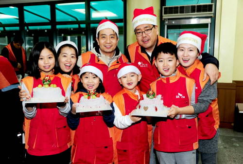이들은 3시간 동안 케이크를 직접 만들고 SK행복김치와 다과를 준비해 정성껏 포장, 이날 행사에 초대한 강남구 지역 저소득 장애인 100가정에 전달했다.