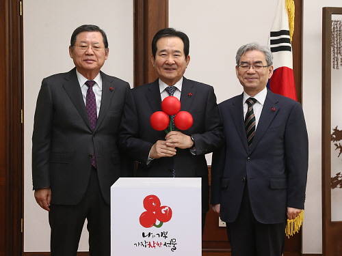 [프라임경제] 정세균 국회의장은 28일 의장집무실에서 사회복지공동모금회(사랑의열매)에 성금을 전달했다. 이날 행사에는 사회복지공동모금회 허동수 회장(왼쪽)과 박찬봉 사무총장(오른쪽)이 함께했다.