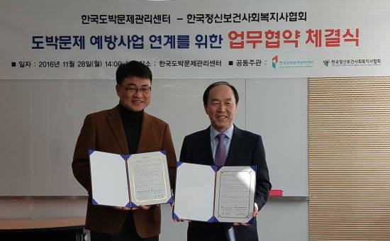 [프라임경제] 한국도박문제관리센터(이하 센터)와 한국정신보건사회복지사협회(이하 협회)가 28일 오후 2시 관리센터 2층 집단상담실에서 도박문제 예방홍보 사업 연계를 위한 업무협약을 체결했다.