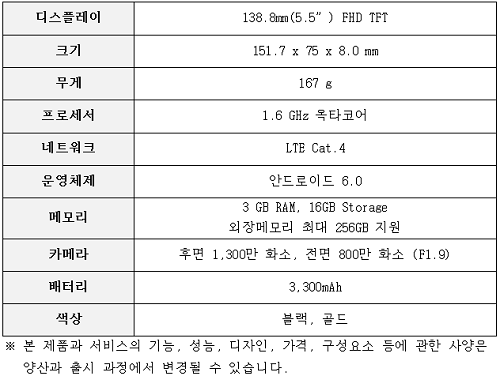1.6GHz 옥타코어와 3GB 램을 탑재했으며 외장 메모리로 최대 256GB까지 용량을 확장할 수 있다. 블랙·골드 색상 16GB 모델로 출시되며 39만9300원의 가격이 책정됐다.