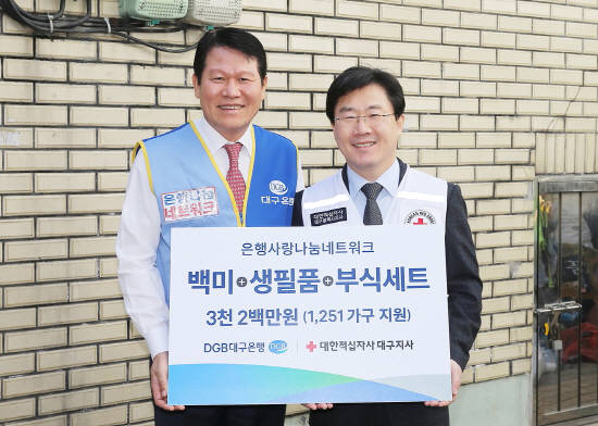 이날 마련된 물품은 DGB대구은행과 대구적십자사가 이달 안으로 지역내 취약계층 총 1251세대를 직접 방문해 백미와 부식세트, 생필품세트를 전달해 따뜻한 겨울 보내기에 힘을 실을 예정이다.