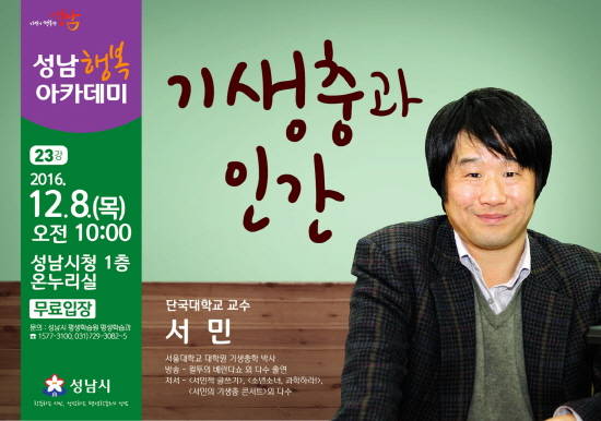 [프라임경제] 경기도 성남시는 '기생충 박사' 서민 교수를 초빙해 오는 8일 오전10시 시청 온누리에서 성남행복아카데미 제23강을 연다.