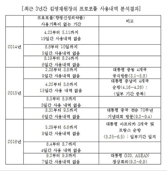 아울러 김 의원은 "2015년 4월 박대통령이 중남미 4개국을 순방하던 4월16일부터 26일, 중국 전승 70주년 기념대회에 참석한 9월2일부터 9월4일, 올해 아프리카 3개국 및 프랑스 순방 5월25일부터 6월5일, G20과 ASEAN 정상회의 9월2일부터 9월9일 사이에는 김영재 원장의 프로포플 사용 기록이 전혀 없었던 것으로 나타났다"고 지적했다.