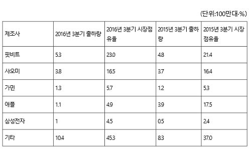 핏비트는 3분기 점유율 23%를 기록해 세계 1위를 유지했다. 샤오미가 16.5%로 2위, 가민이 5.7%로 3위 등이었다. 이들 회사는 모두 작년 3분기보다 출하량이 증가했다.