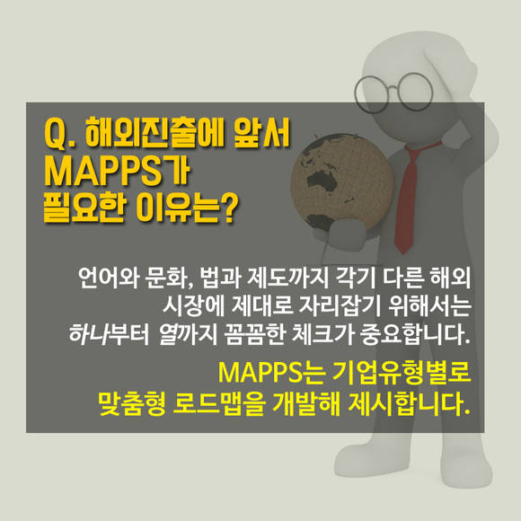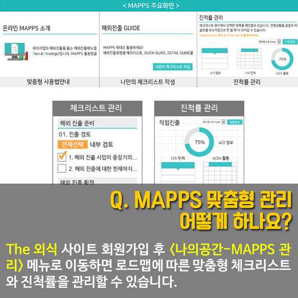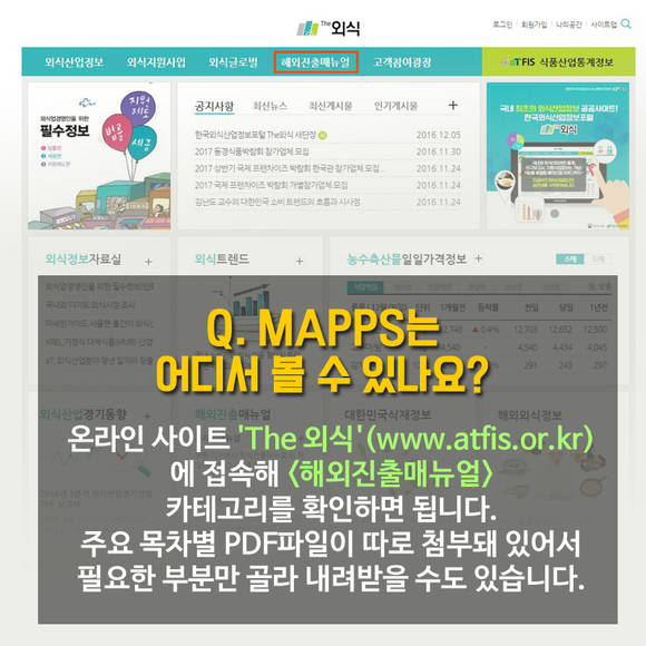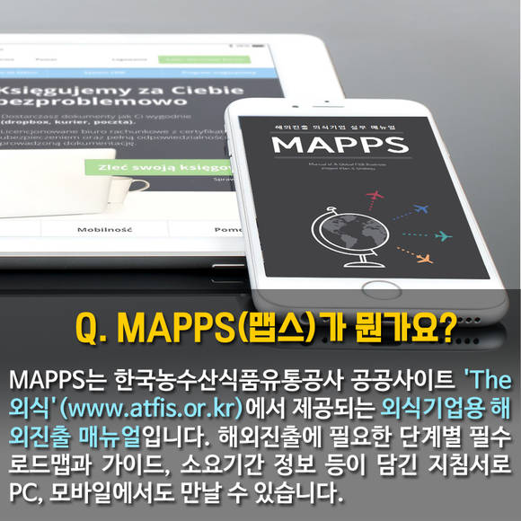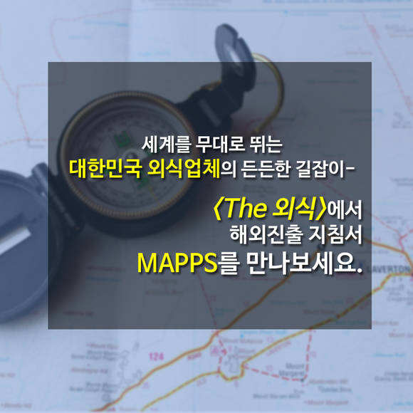 특히 외식기업의 해외진출을 지원하기 위한 맞춤형 지침서인 'MAPPS'(Manual of A Global F&B Business Project Plan & Strategy)를 개발한 것이 눈에 띈다. MAPPS는 현지 진출에 필요한 청사진과 단계별 필수항목을 포함한 가이드라인을 제시하고 기업별로 맞춤형 체크리스트와 진척률 관리서비스를 제공한다.