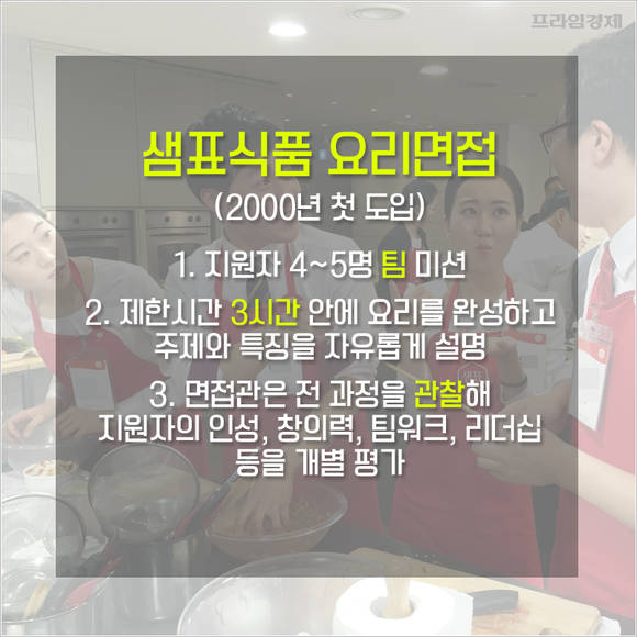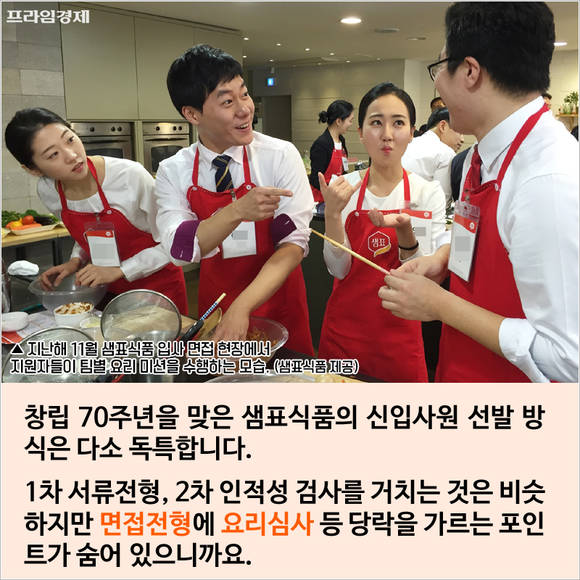 [프라임경제] 창립 70주년을 맞은 샘표식품(이하 샘표)의 신입사원 선발 방식은 독특하기로 유명하다. 1차 서류전형, 2차 인적성 검사를 거치는 것은 일반 기업과 마찬가지인데 3차 면접전형에 팀별 요리심사 등 당락을 가르는 포인트가 있기 때문.