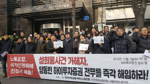 김현정 사무금융노조 위원장은 "A 전무는 현대중공업이 경영문제를 하이투자증권에 전가하고 매각을 진두지휘하기 위해 내려보낸 인물"이라며 "노사관계를 파탄으로 이르게 하고 지속적인 성희롱 발언, 리테일 업무를 벌레 취급했던 태도 등은 직원들의 인격 살인"이라고 비판했다.