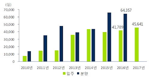 2017년 주요 분양계획 단지로는 경기 화성시 동탄2신도시롯데캐슬(700실), 경기 안산시 그랑시티자이2차(473실), 부산 강서구 대방노블랜드(1926실) 등이 있다. 그동안 개발이 연기됐던 서울 청량리4구역은 올해 철거를 시작한 후 주상복합 단지로 거듭나게 된다.