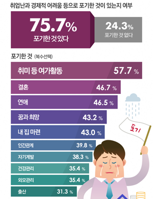 취업포털 사람인(대표 이정근)이 20~30대 성인남녀 955명을 대상으로 '취업난과 경제적 어려움 등으로 포기한 것이 있는지 여부'를 조사한 결과 75.7%가 '포기한 것 있다'고 답해 지난해 69% 대비 6.7%p 올라갔다.