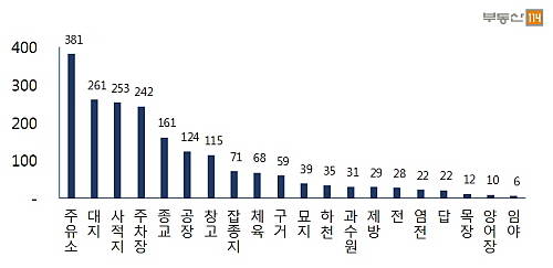 지목별 토지 평균 거래가격을 살펴보면 '주유소'가 3.3㎡당 381만원으로 가장 비싸고, 토지활용도가 높은 '대지'가 261만원이었다.